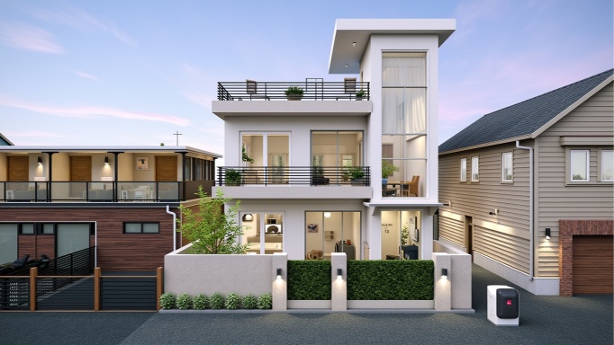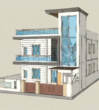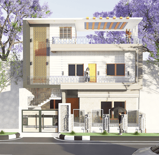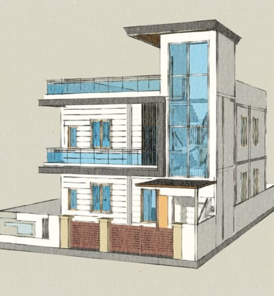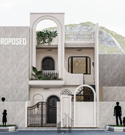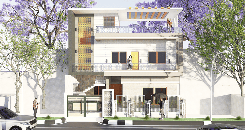 The design of the two-storeyed residence presented a unique challenge due to the narrow width of the elevation. To maximize space and achieve an appealing style, we skillfully merged two plots, creating an L-shaped site boundary that effectively enhanced both functionality and aesthetics of the home.